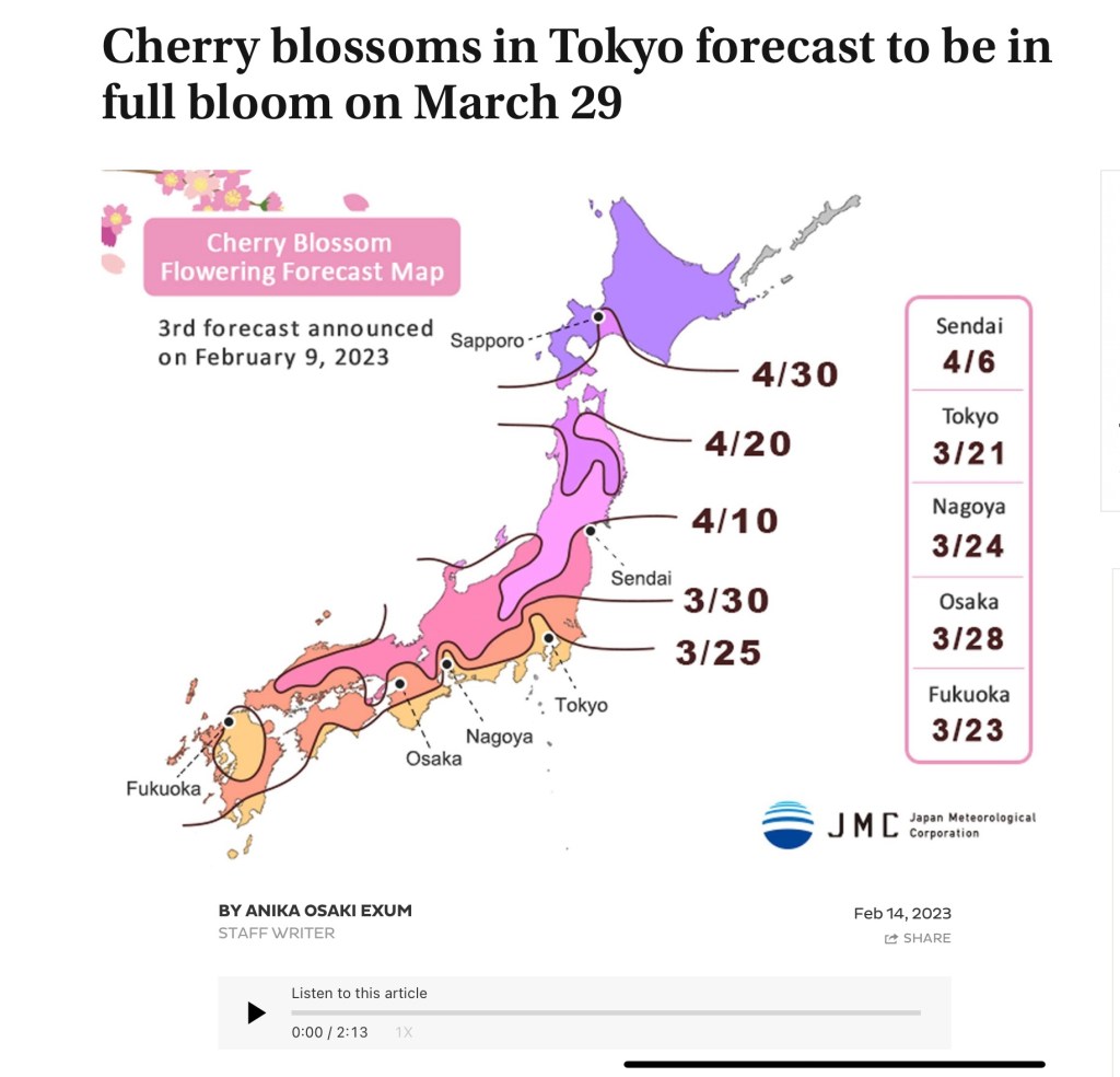 Some of the most memorable scenery you will see anywhere in the world. Cherry Blossoms alone are worth the trip to Japan. You can read more on dates of optimal view on the Japan Times website.