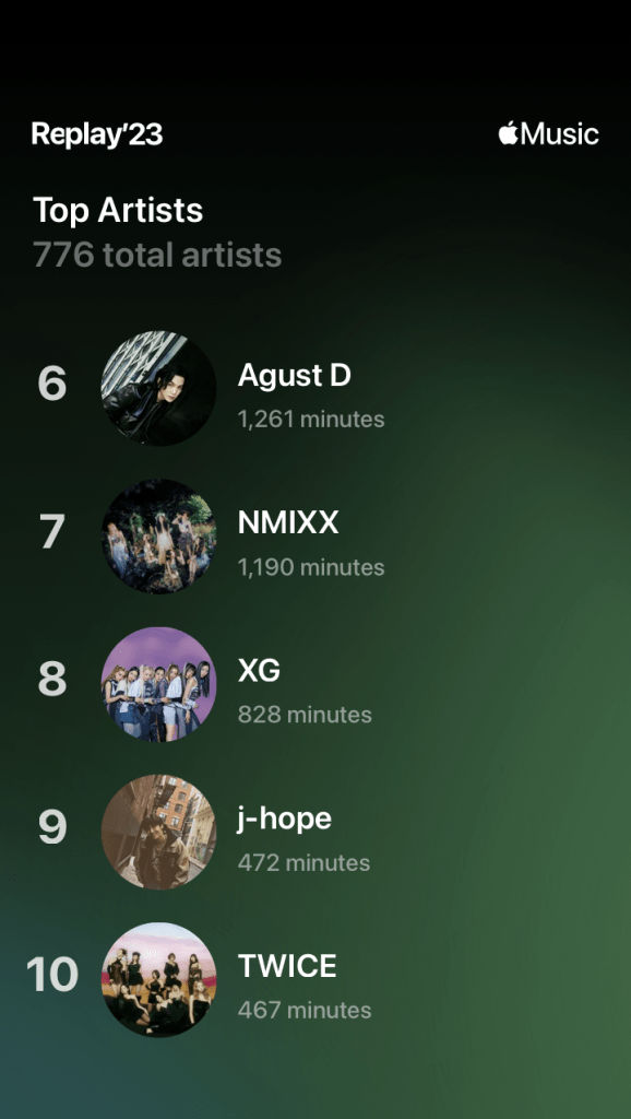 The fact that Agust D is only number 6 in our Apple Replay’23 list of top artist shows you just how memorable 2023 has been in terms of music. We were blessed with the opportunity to be there in New York for the opening of his tour (and in the pit). When people ask how could we like BTS, we simply play Deachwita for them!!!