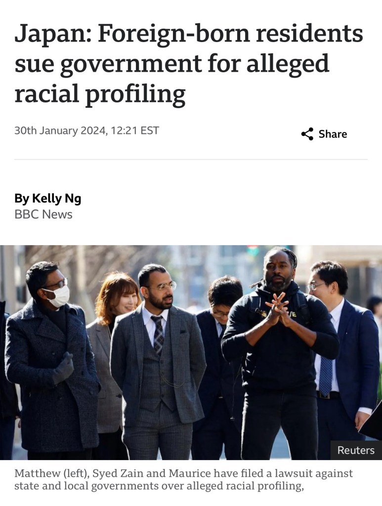In an article posted by the BBC, foreign born residence in Japan have sued the gov’t for alleged racial profiling. According to the article;