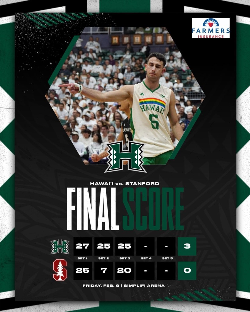 The University of Hawaii men’s volleyball team sweep the Stanford Cardinals last night before a near sell out crowd on 9,000 plus.