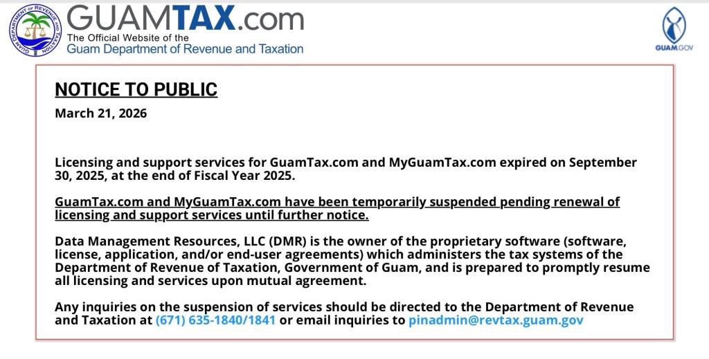 Conducting business on the island of Guam is about to be more inconvenient for the foreseeable future. The website the island uses for withholding, GRT, taxes including filing W2 and W2C, and getting records including payment history is down indefinitely.